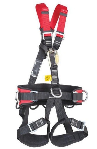 CONSTRUCTIE: protector lombar captusit, profil ergonomic, chinga neagra circulara reglabila cu caratame, 2 inele laterale de pozitionare, bretelele de picioare reglabile cu catarame metalice, construite astfel incat sa poata oferi pozitia de sezut, bretele de umar dorsale care au inserat inelul de ancorare prins in placa din material plastic, iar frontal se termina cu 2 bucle textile pentru ancorare, prinse intr-o carabiniera din otel galvanizat, care face legatura cu chinga care vine de la centura de pozitionare si inelul de stat in centura (scaun), inele dorsale pentru scule;
