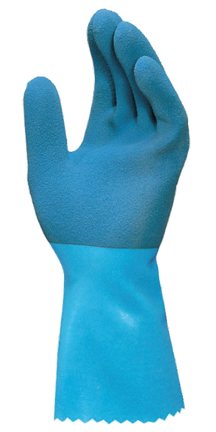 CONSTRUCTIE: manusa de protectie chimica, fara cusatura, cu 5 degete, grosime 1.15 mm., in interior suport textil, in exterior textura nisipoasa, fara silicon;