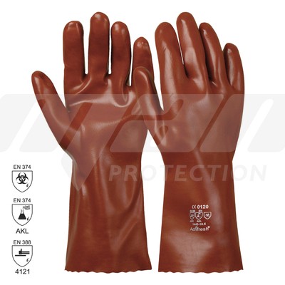 CONSTRUCTIE: manusi cu 5 degete, din PVC cu captuseala din tricot interlok, manseta larga, lungime 350 mm, tratate Sanitized® pentru protectie impotriva micro-organismelor;