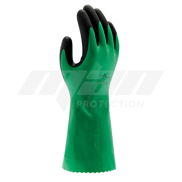 CONSTRUCTIE: manusa de protectie chimica, fara cusatura, cu 5 degete, grosime 0.38 mm., dublu strat de nitril si impregnare cu spuma nitrilica pe palma si degete, inclusiv varful acestora, interior textil din bbc. si polyester;