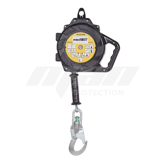 CONSTRUCTIE: EIP de lucru la inaltime compus dintr-un cablu de otel, infasurat intr-o carcasa, in care exista un mecanism de oprire automata, instatanee si amortizata a acestuia, in cazul unei caderi de la inaltime.