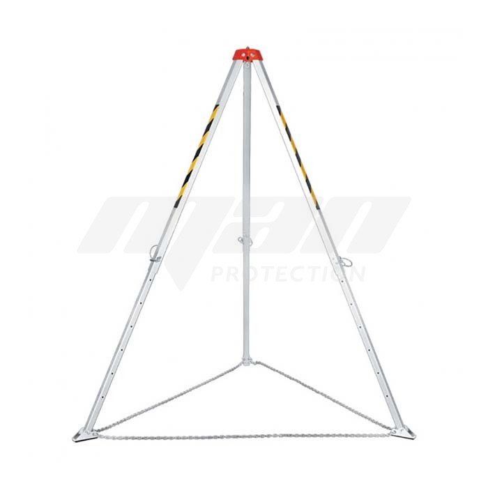 CONSTRUCTIE: EIP de lucru la adancime (canale), format din 3 picioare, reglabile in 7 puncte, asigurate la baza pentru stabilitate, cu un lant prins cu carabiniera, talpile picioarelor au tampoane din cauciuc pentru suprafete plane si varfuri pentru suprafete alunecoase, capul trepiedului include rotile de ghidare.